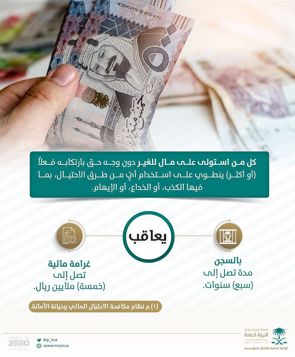 وأضافت النيابة عبر “تويتر”، أن عقوبة التورط في هذه الأعمال تشمل “السجن مدة تصل إلى سبع سنوات، وغرامة مالية تصل إلى خمسة ملايين ريال”.