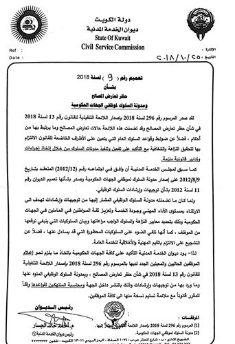 وعلمت «الأنباء» أن رئيس ديوان الخدمة المدنية م. أحمد الجسار طالب في تعميم صدر أمس لجميع الجهات الحكومية- حصلت «الأنباء» على نسخة منه – بإعلام الموظفين باللائحة التنفيذية لقانون حظر تعارض المصالح.