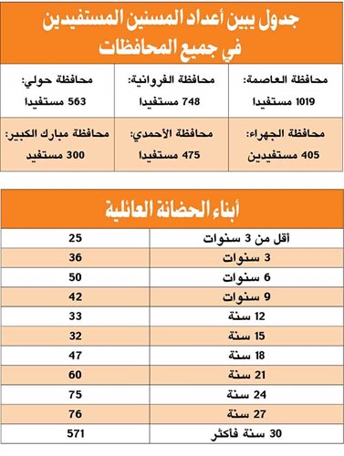 كما أوضحت العدواني ان عدد الحالات التي تستفيد من الخدمة المتنقلة داخل منازلها ووسط بيئتها الطبيعية بلغت 3150 حالة، في حين أن عدد الحالات في الدور الإيوائية لم يتعد الـ28 حالة فقط.