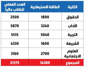 مع اقتراب الانتقال إلى مدينة صباح السالم الجامعية (الشدادية)، وبدء الدراسة في 5 كليات مع بداية العام الدراسي سبتمبر المقبل، دق جامعيون جرس إنذار لتفادي فضيحة أزمة في الطاقة الاستيعابية ببعض الكليات. وبينت الإحصائيات الرسمية أن الطاقة الاستيعابية في تلك المباني تتسع لنحو 14380 طالباً وطالبة، علماً بأن العدد الفعلي للطلبة حالياً 21375، أي إن نسبة النقص %33وتساوي 7 آلاف طالب، وهذا يخص كليات الحقوق والآداب والتربية والشريعة والعلوم الاجتماعية. في المقابل، أشار مراقبون إلى أن الجامعة لم توفق في توزيع الطاقة الاستيعابية لكلياتها؛ لأن هناك كليات تحتوي على طاقة استيعابية كبيرة بينما ليس بها عدد كبير من الطلبة. وأكدوا أن تغيير خطط القبول قد يعالج هذه الفجوة بتوجيه الطلبة إلى التخصصات التي تعاني نقصاً في الكوادر الوطنية، لكن إلى ذلك الحين ستواجه «الشدادية» أزمة قبول ببعض الكليات. وكشفت مصادر مطلعة أن الجامعة قد تتدارك الأزمة عبر حلول منها نظام الجدول المركزي، بحيث تضع جدولاً للمحاضرات وفقاً للقاعات المتوافرة في الكليات المجاورة.