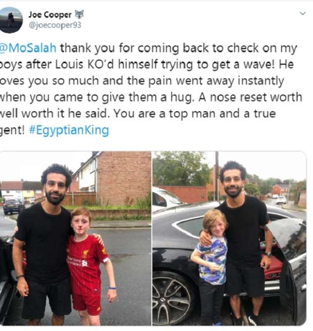 فيما نشر جو كوبر، زوج والدة لويس، صورة للطفل وصلاح معًا، معلقا عبر “تويتر” بحسب “الوطن”: “بينما كنا سنطلب الإسعاف، رأينا صلاح يقود سيارته بالقرب منا بعدما رأى لويس، وقد اقترب حتى يطمئن عليهما”.